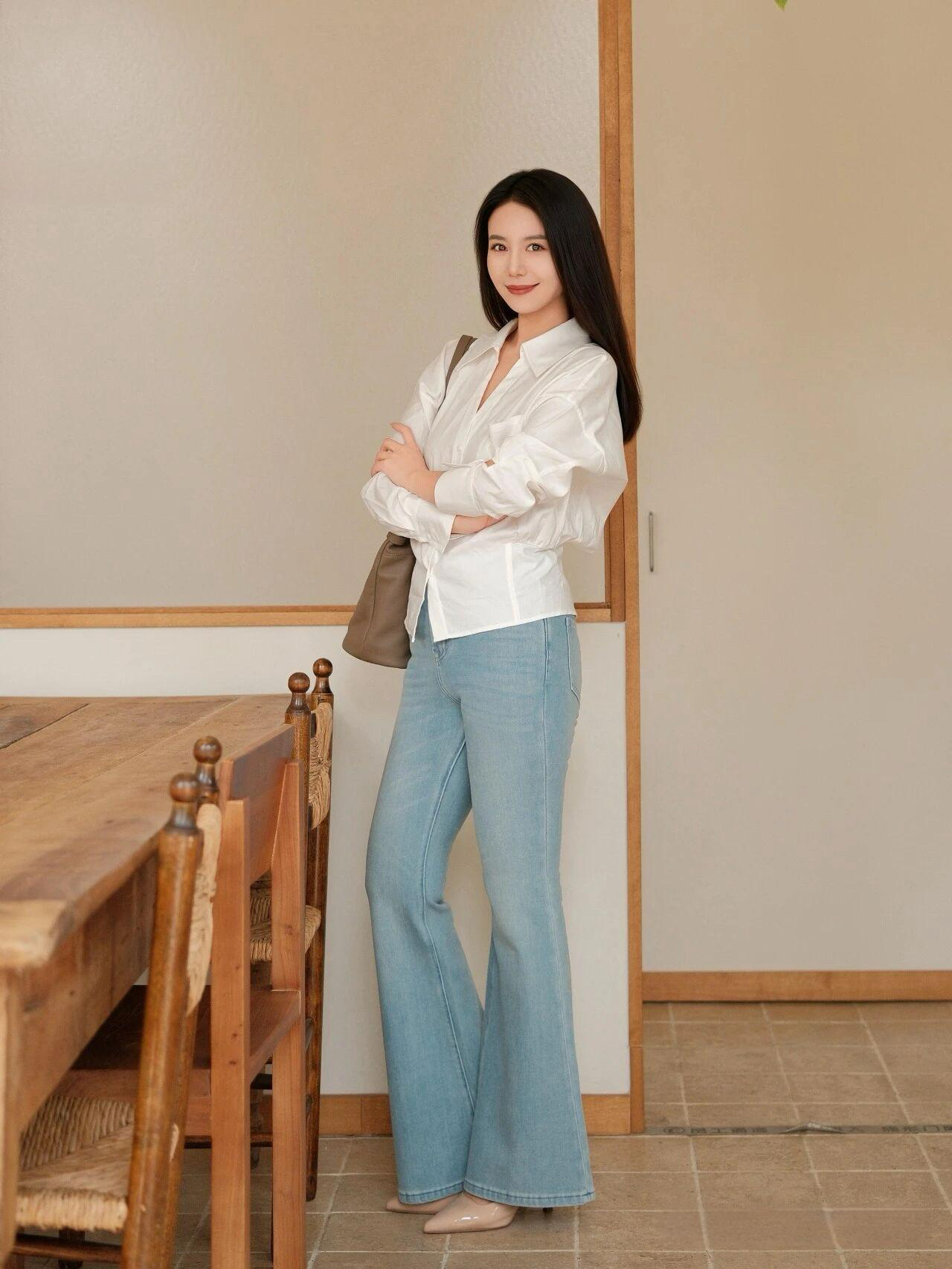 This outfit is a classic and timeless combination that balances casual elegance with comfort. The white blouse is crisp and versatile, offering a polished look that pairs beautifully with the light wash, flared jeans. The blouse has a structured silhouette which creates a nice contrast against the relaxed fit of the jeans, adding an element of sophistication.