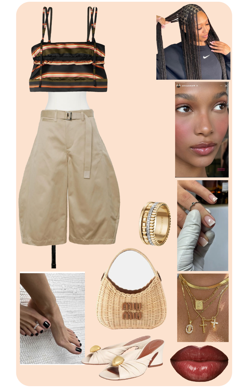 The accessories are thoughtfully curated to enhance the look. The gold rings and layered necklaces add a touch of elegance and sophistication, introducing additional textures that elevate the ensemble. The choice of an ivory woven handbag adds a hint of bohemian charm, while the slide sandals with a minimalist design contribute to a casual yet polished finish. The sandals’ open-toe style and their alignment with the color palette further emphasize the laid-back vibe of the ensemble.