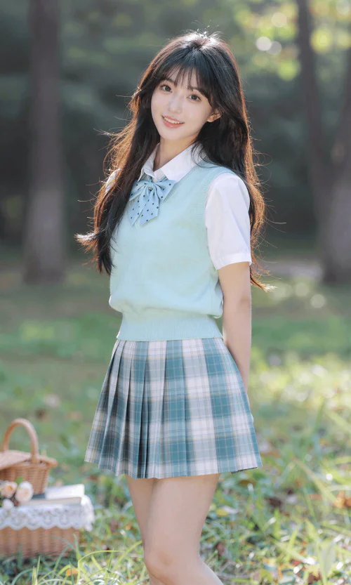 The fit of the sweater vest and shirt appears well-proportioned, allowing for a comfortable yet polished silhouette. The pleated skirt adds a youthful and dynamic element, contributing to the outfit's balanced proportions. The use of pastel shades gives the ensemble a soft, approachable feel that is well-suited to a casual, outdoor setting like a park or a picnic.