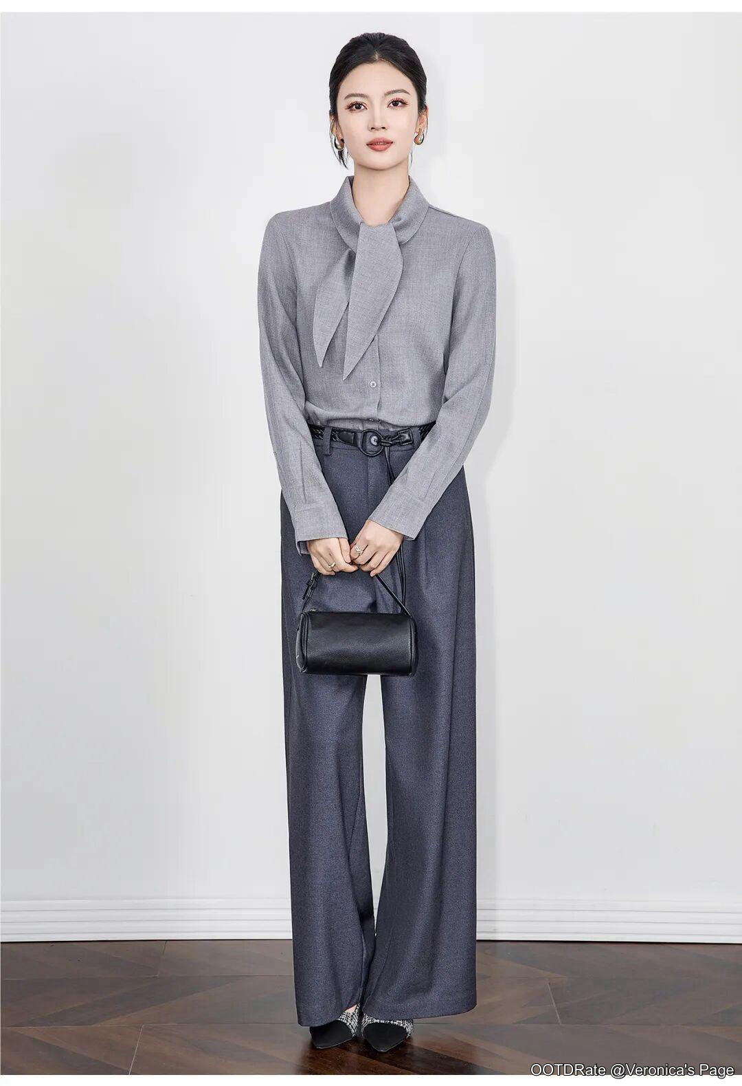 This outfit presents a sophisticated, monochromatic ensemble that exudes elegance and professionalism. The grey blouse features a unique tie detail at the neck, adding both texture and visual interest. Its clean lines and tailored fit enhance the outfit’s polished aesthetic, making it suitable for a formal business environment. Complementing the blouse, the wide-leg trousers offer a flattering silhouette that elongates the figure. Their high waist design works well with the tucked-in blouse, creating a cohesive and well-proportioned look.