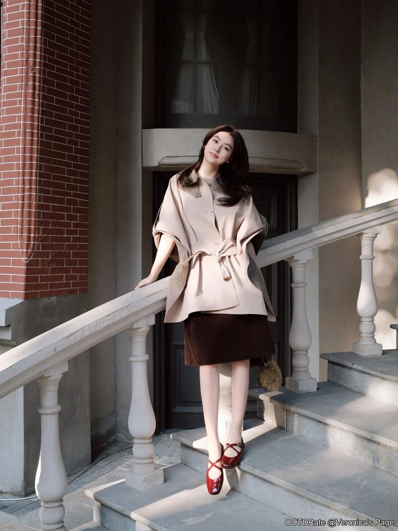 Elegant Cape with Red Ballet Flats and Rich Brown Skirt
