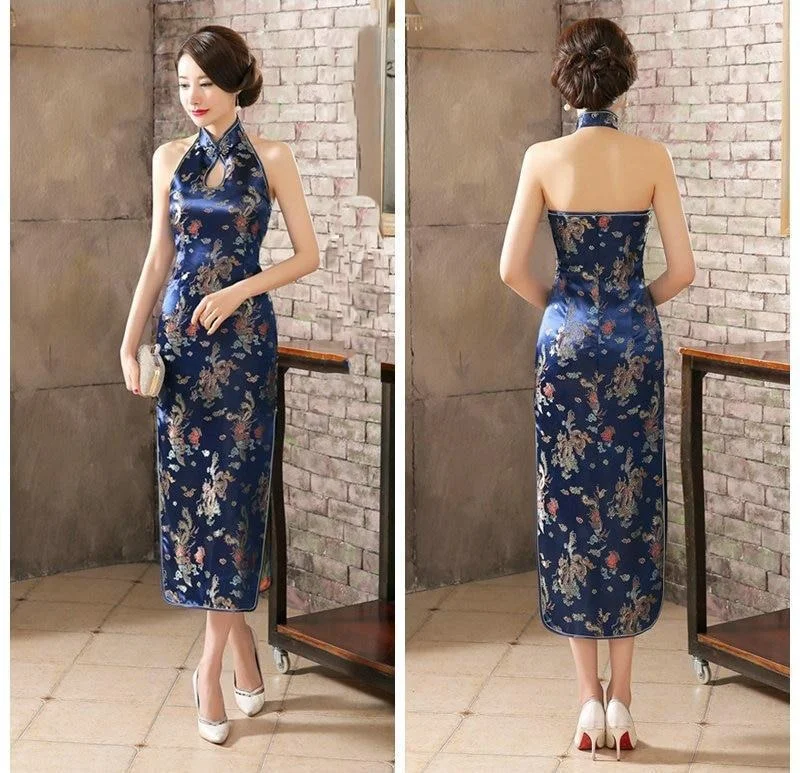 The outfit features a stunning and elegant blue cheongsam with a floral pattern, showcasing traditional Chinese design elements. The rich blue color accentuates the intricate floral motifs, adding sophistication and allure. The high neck and form-fitting silhouette highlight a classic and timeless appeal, celebrating femininity with grace.