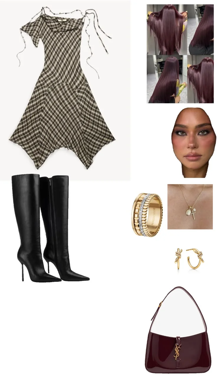 Modern Checkered Dress with Edgy Black Boots and Burgundy Accents