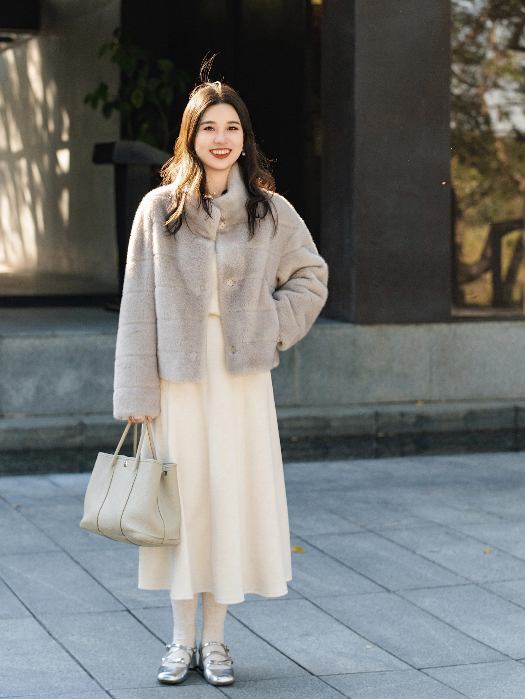 This outfit is an elegant combination of soft and neutral tones, ideal for a chic winter look. The light gray faux fur jacket adds a touch of luxury and warmth, perfectly suited for cold weather while maintaining style. Paired with an ivory midi dress, the ensemble maintains a cohesive aesthetic, presenting a soft and feminine look. The dress itself likely offers a comfortable and relaxed fit, contributing to an easygoing yet sophisticated vibe.