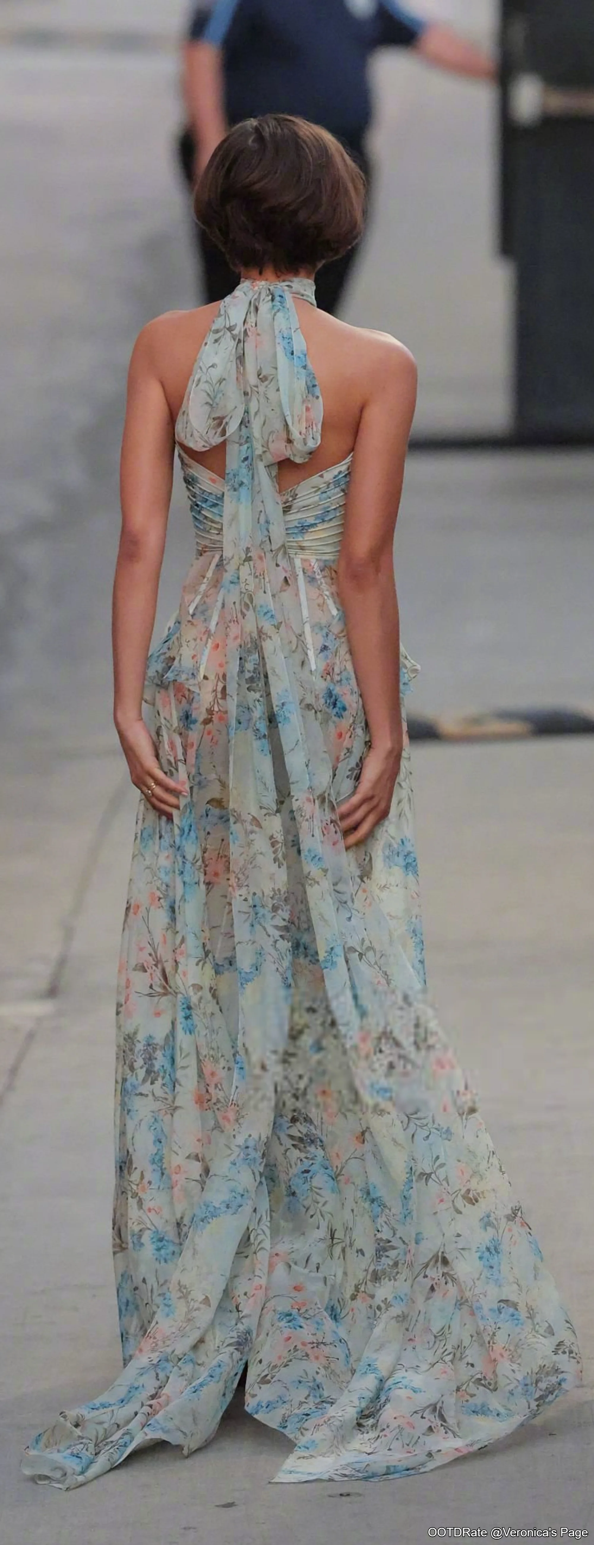 This outfit deserves an 8.9 out of 10. The halter-neck floor-length dress features a beautiful sheer material adorned with a muted floral print. The choice of soft blues, pinks, and greens creates an airy, romantic feel that is perfect for a summer event or an outdoor gathering. The draping fabric adds a touch of elegance and movement, contributing to an ethereal silhouette.