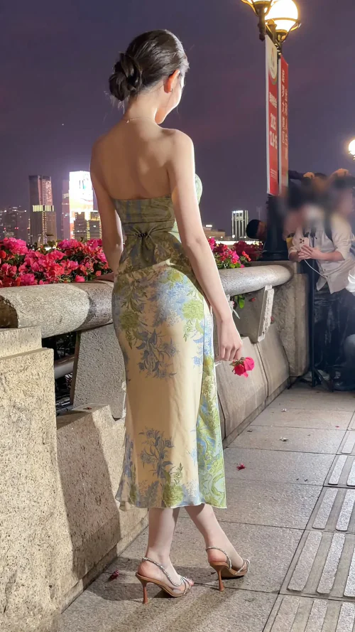 The choice of shoes stands out with neutral high heels, adding height and ensuring the focus remains on the dress’s beautiful pattern. A back tie accentuates the waist, providing a flattering fit and adding a charming detail to the overall look.