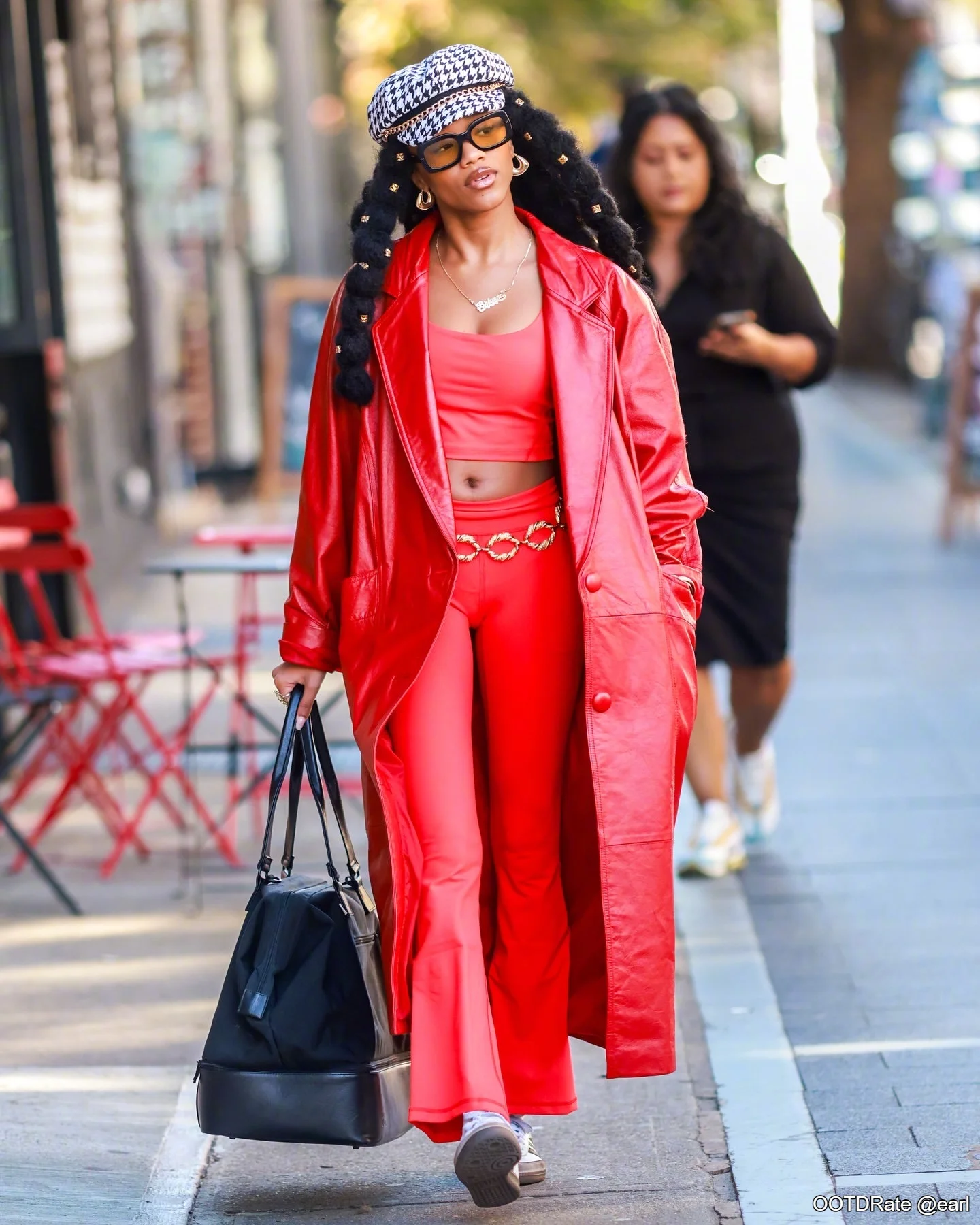 This outfit is vibrant and bold, featuring a cohesive red theme from top to bottom. The long red leather coat stands out as a statement piece, creating a powerful visual impact. It pairs well with the red crop top and flared pants, maintaining a monochromatic look that is both striking and stylish. The addition of a gold chain belt adds a touch of flair and breaks the color monotony effectively, introducing a hint of luxury.