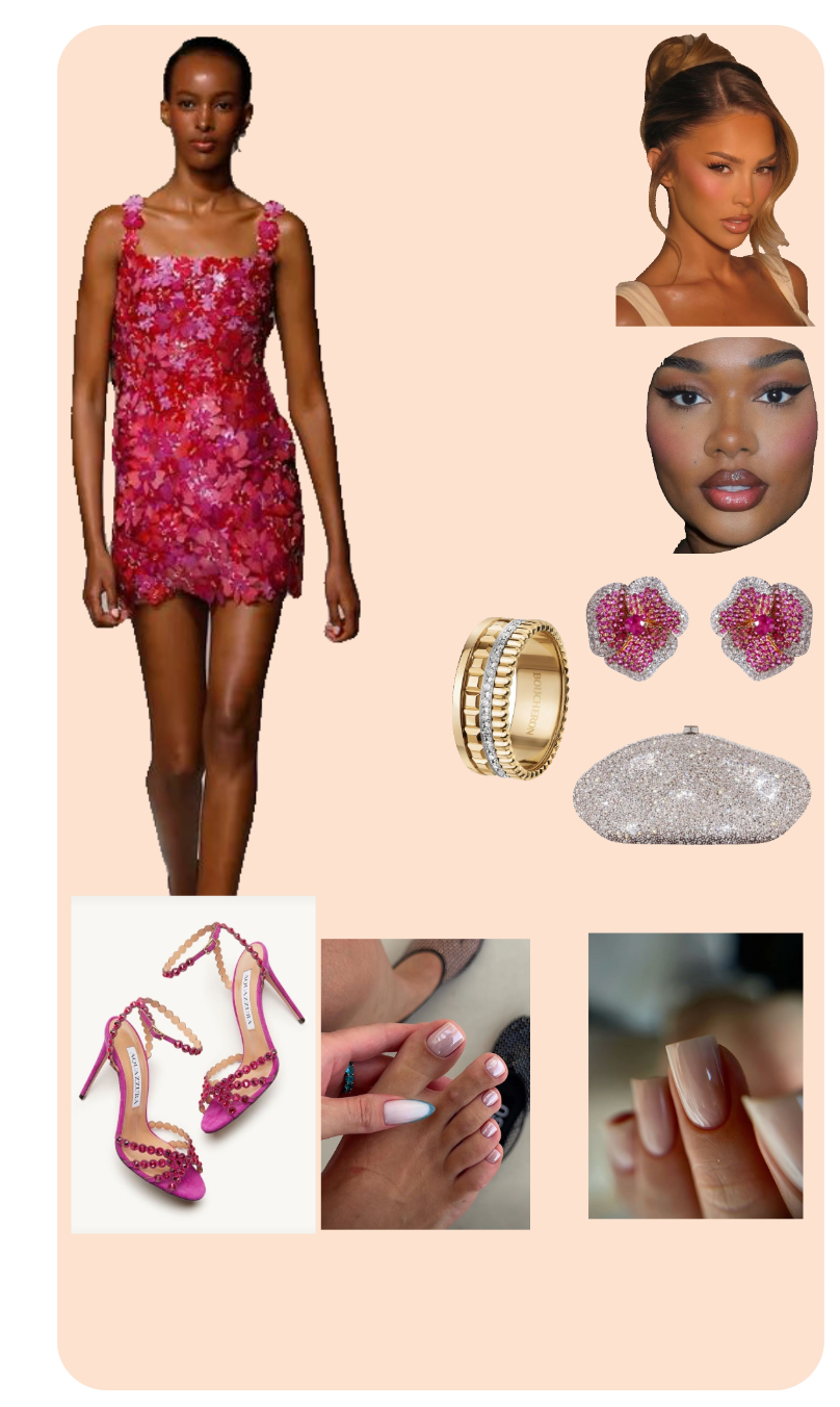 This outfit is a stunning combination of vibrant colors and chic accessories, earning an 8.9 out of 10. The centerpiece of the ensemble, a vibrant floral mini dress, is both striking and elegant. The choice of rich pink and red hues in the dress gives it a lively, romantic vibe that's perfect for evening occasions or cocktail parties. The fitted silhouette and floral detailing accentuate a modern, feminine look.
