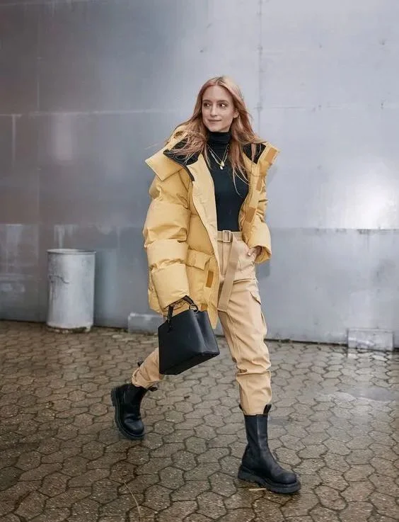This outfit scores an 8.9 out of 10. The ensemble combines a utilitarian-chic aesthetic with a warm, winter-ready vibe. The standout piece is the oversized yellow puffer jacket which adds volume and interest, creating a bold statement. This pairs harmoniously with the beige utility pants featuring multiple pockets, enhancing the functional yet stylish look. The choice of a black turtleneck top underneath is smart, balancing the boldness of the jacket while also providing a streamlined, polished appearance.