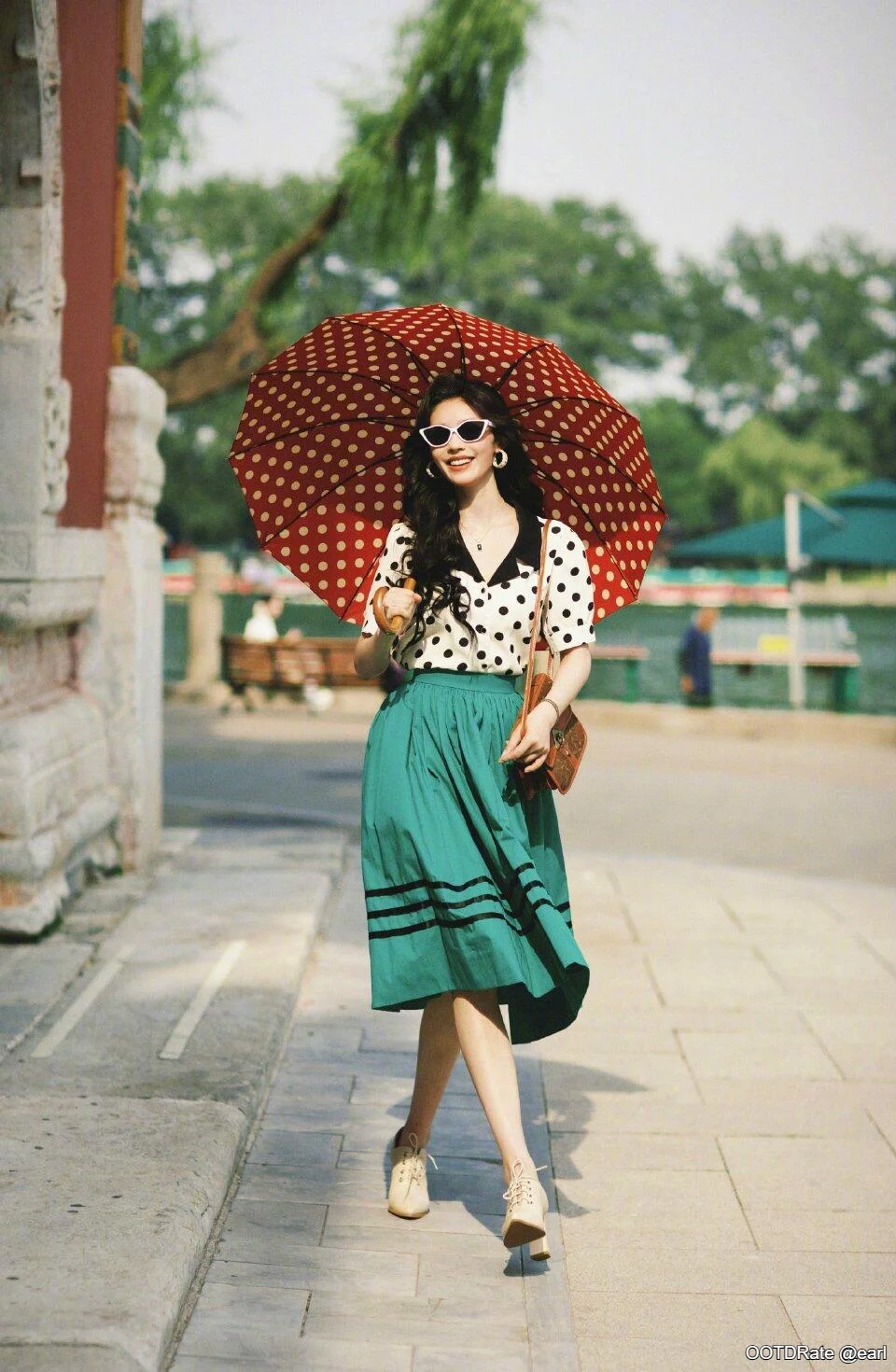 The skirt's length and A-line silhouette contribute to a flattering proportion, enhancing the overall vintage appeal. Accessories like the polka dot umbrella tie into the theme seamlessly, cleverly echoing the blouse's pattern without overwhelming it. The white sunglasses add a touch of whimsy and further emphasize the retro influence. The brown shoulder bag and cream lace-up shoes complement the ensemble without stealing focus, offering functional yet stylish touches.