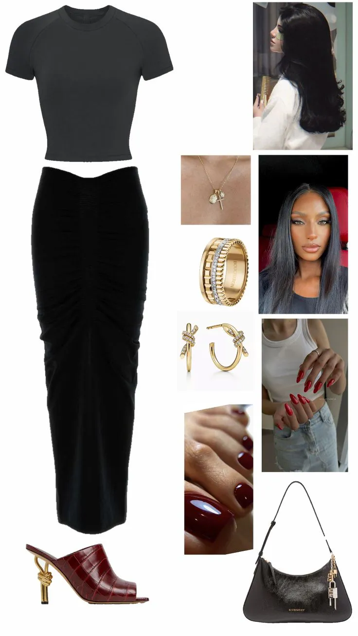 The fitted black cropped top paired with the high-waisted ruched black skirt creates a sleek silhouette, exuding a chic and modern vibe. The ruched detailing adds a touch of intrigue to the look, making it more dynamic.