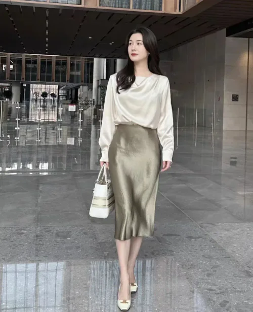 Elegant Cream Satin Blouse and Gold Pencil Skirt Ensemble for Sophisticated Style