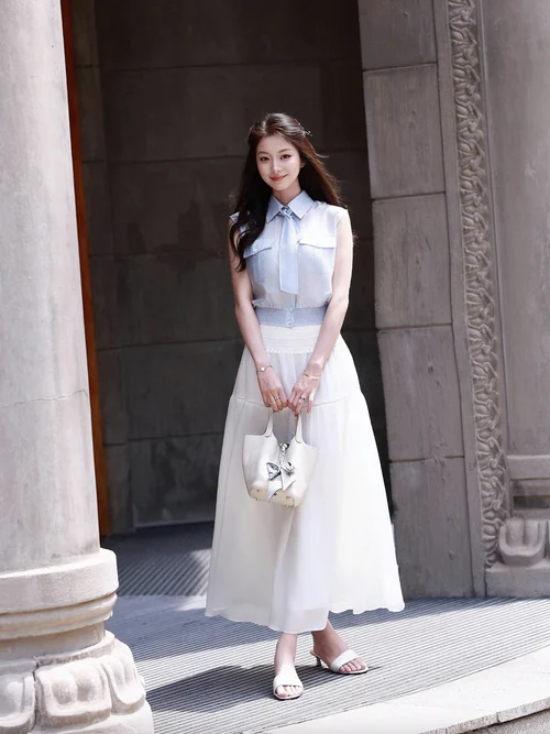 This outfit beautifully balances elegance and simplicity, making it ideal for a leisurely day out or a casual gathering. The light blue sleeveless top features a structured design and elegant bow detail, which adds a touch of sophistication while maintaining a relaxed vibe. The high-waisted, flowing white skirt pairs perfectly with the top, enhancing the outfit's overall ethereal quality. The skirt's length is flattering and versatile, suitable for both daytime and evening occasions.