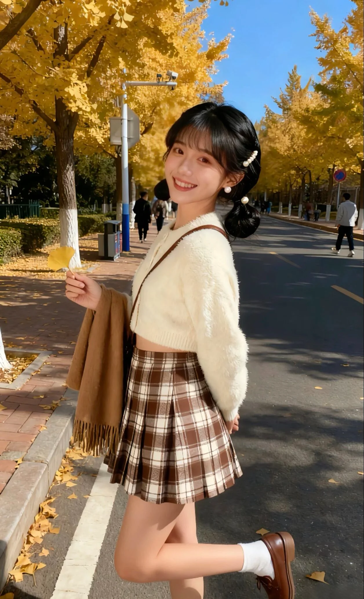This outfit combines a chic, autumnal aesthetic with classic elements for a warm and playful look. The cream-colored fuzzy sweater complements the plaid pleated skirt, delivering a harmonious blend of textures. The choice of brown and cream in the skirt echoes the seasonal palette, ideal for a crisp fall day.