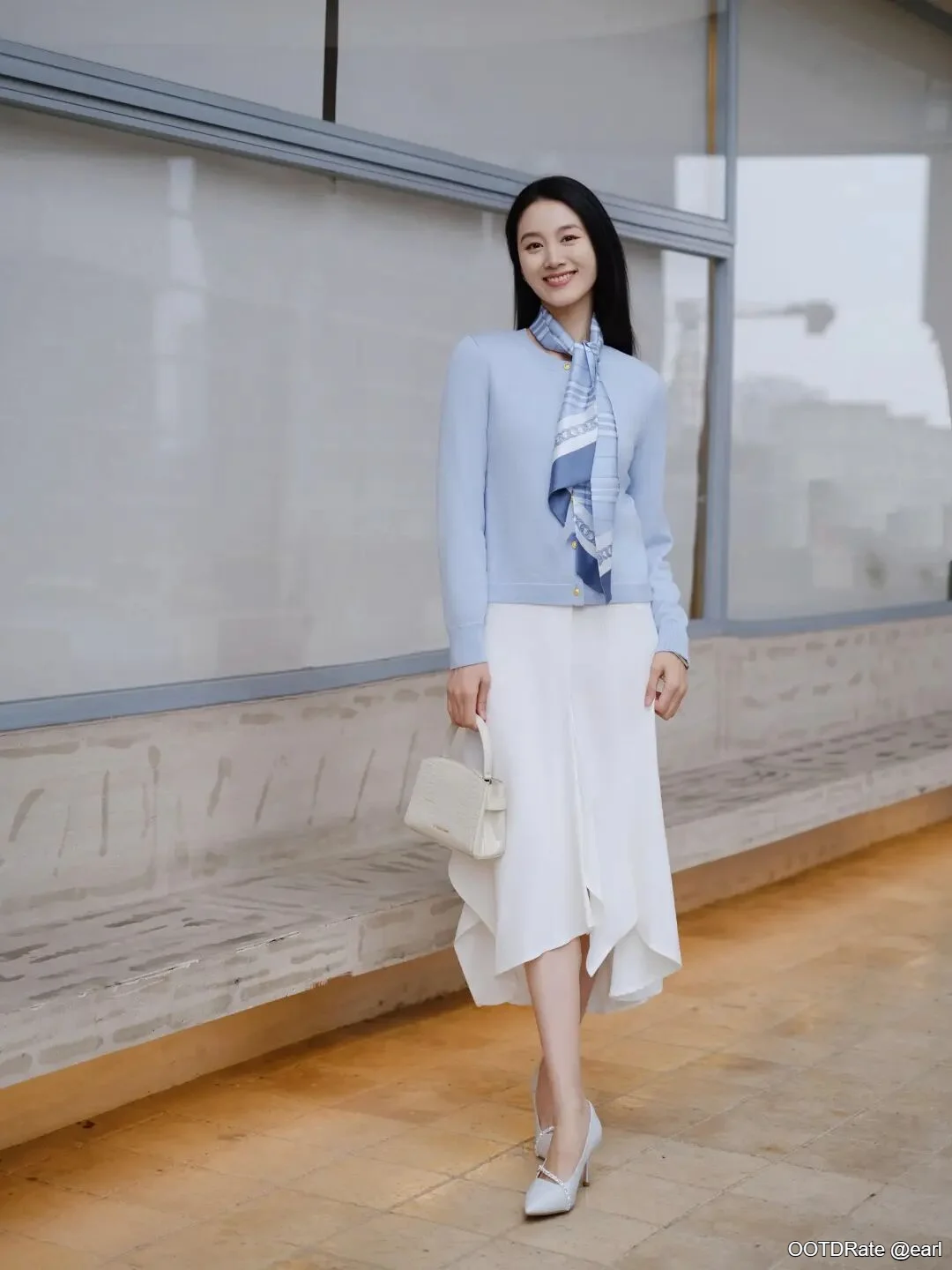 This outfit is a lovely blend of elegance and simplicity, earning it a solid 8.9 out of 10. The combination of soft blue and crisp white creates a refreshing and sophisticated palette. The light blue sweater works harmoniously with the scarf, adding both warmth and a splash of pattern to the ensemble. The way the scarf is tied—draping effortlessly—adds a touch of flair and draws attention towards the neckline without overwhelming the outfit.