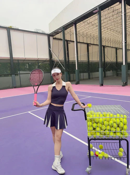 This stylish tennis outfit scores an 8.9 out of 10. The combination of a navy tank top and matching pleated skirt offers both functionality and fashionable flair, perfect for the tennis court. The skirt's white accents add a touch of contrast that breaks the monotony, enhancing the visual appeal. The overall silhouette is sporty and chic, allowing for ease of movement while maintaining a sleek appearance.