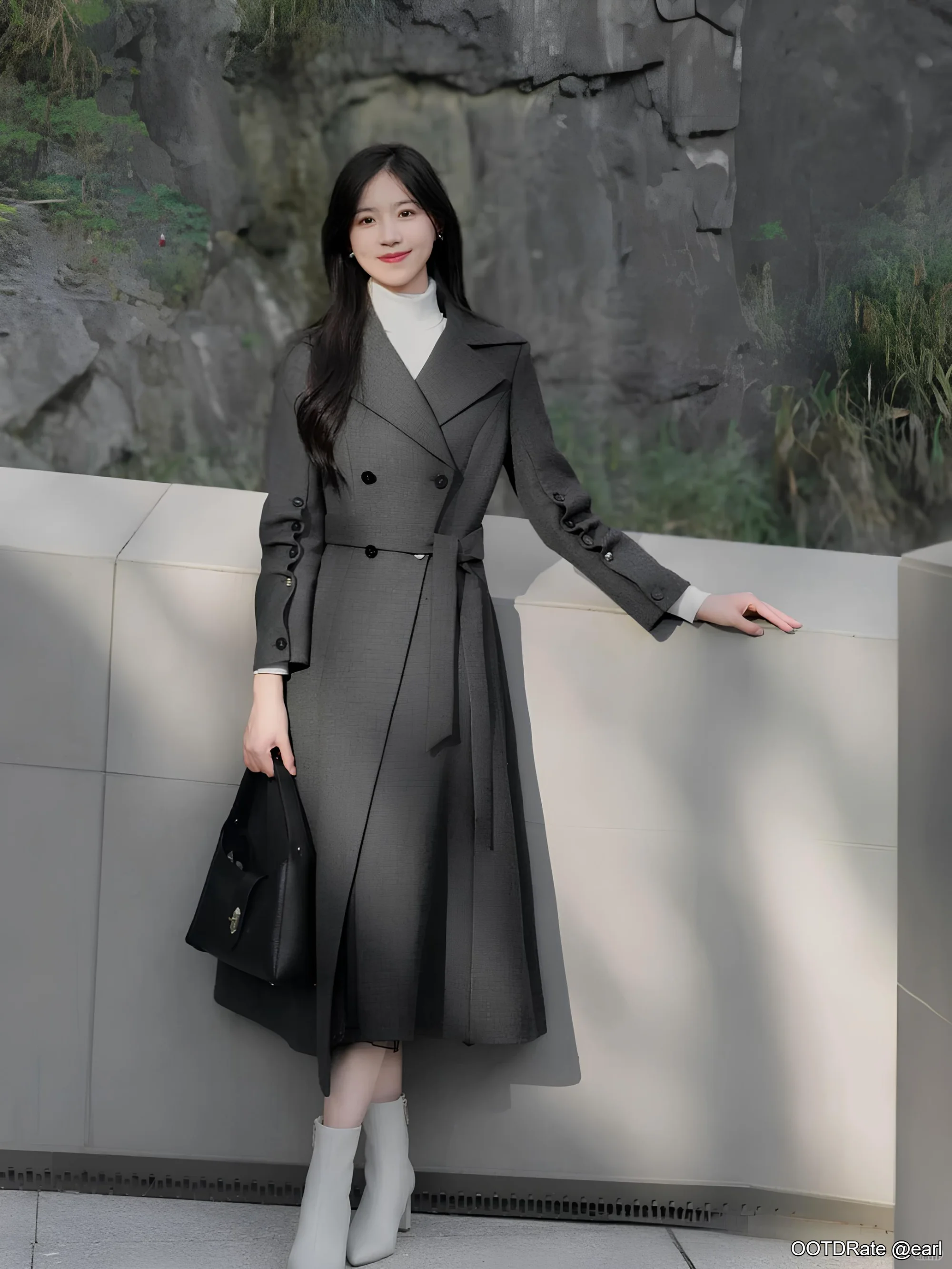 The choice of light gray ankle boots is an excellent addition, harmonizing with the coat and adding a subtle modern twist to the classic style. They provide just the right amount of differentiation without overpowering the outfit's color scheme. The black handbag is a smart accessory choice, offering functionality without distracting from the outfit’s visual balance.