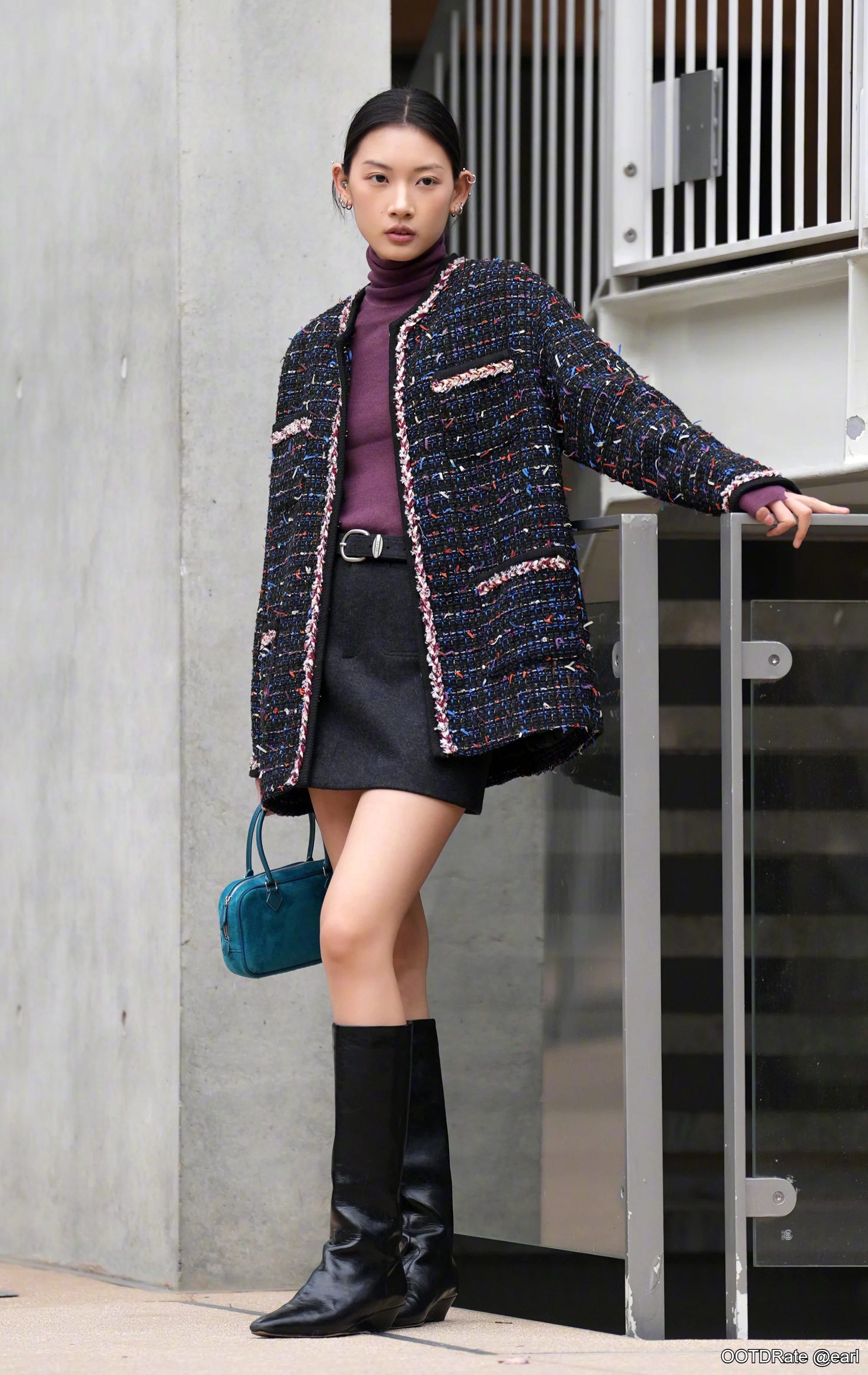 Stylish Tweed, Plum Turtleneck, and High Boots for a Chic Urban Look