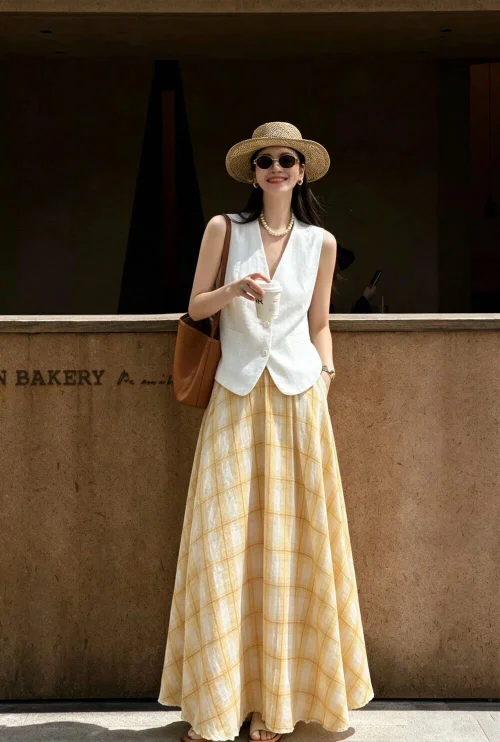 Classic White Vest and Flowing Yellow Plaid Skirt: A Perfect Summer Combination