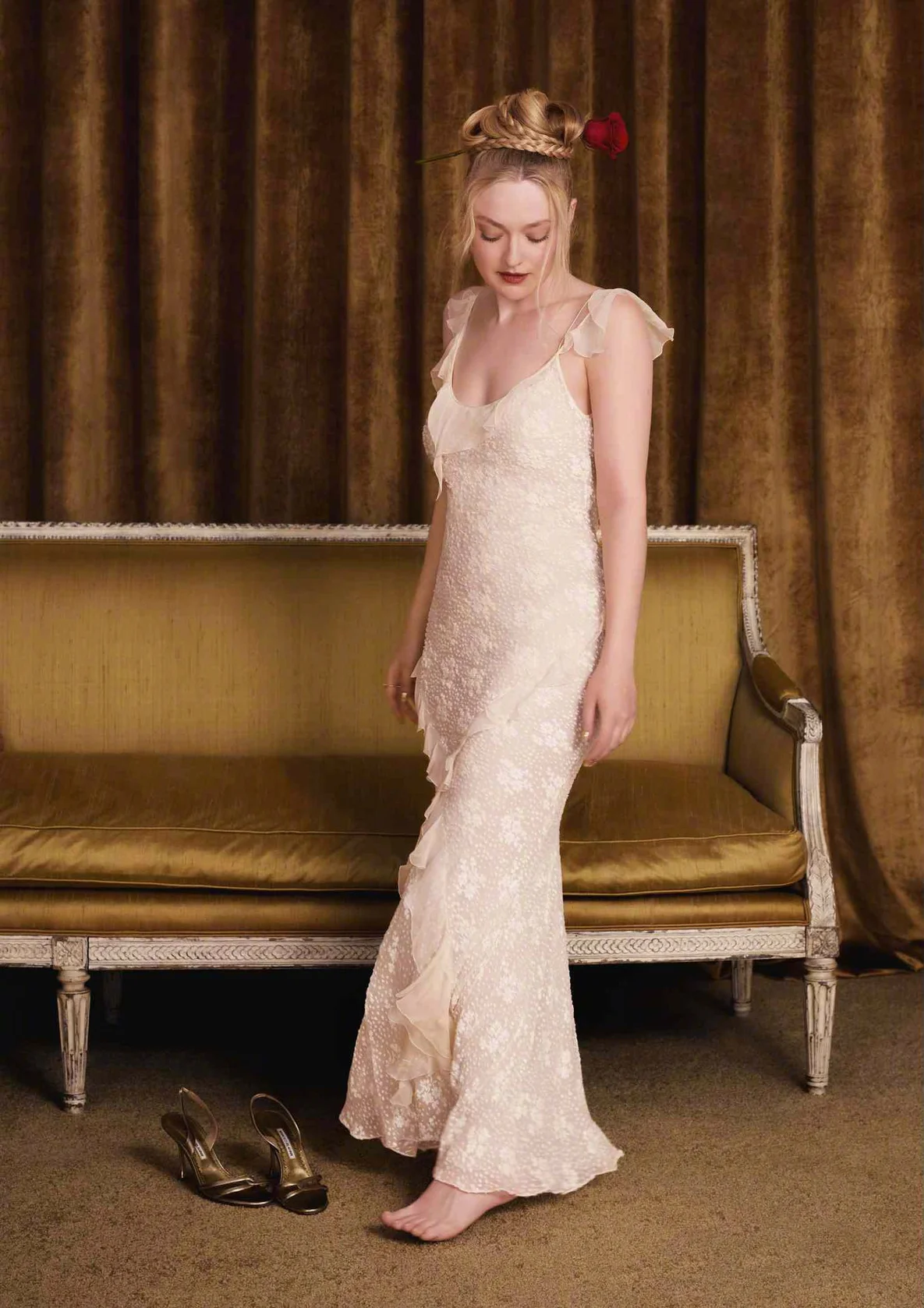 Dakota Fanning in Vintage Lace Dress with Subtle Ruffles and Soft Silhouette