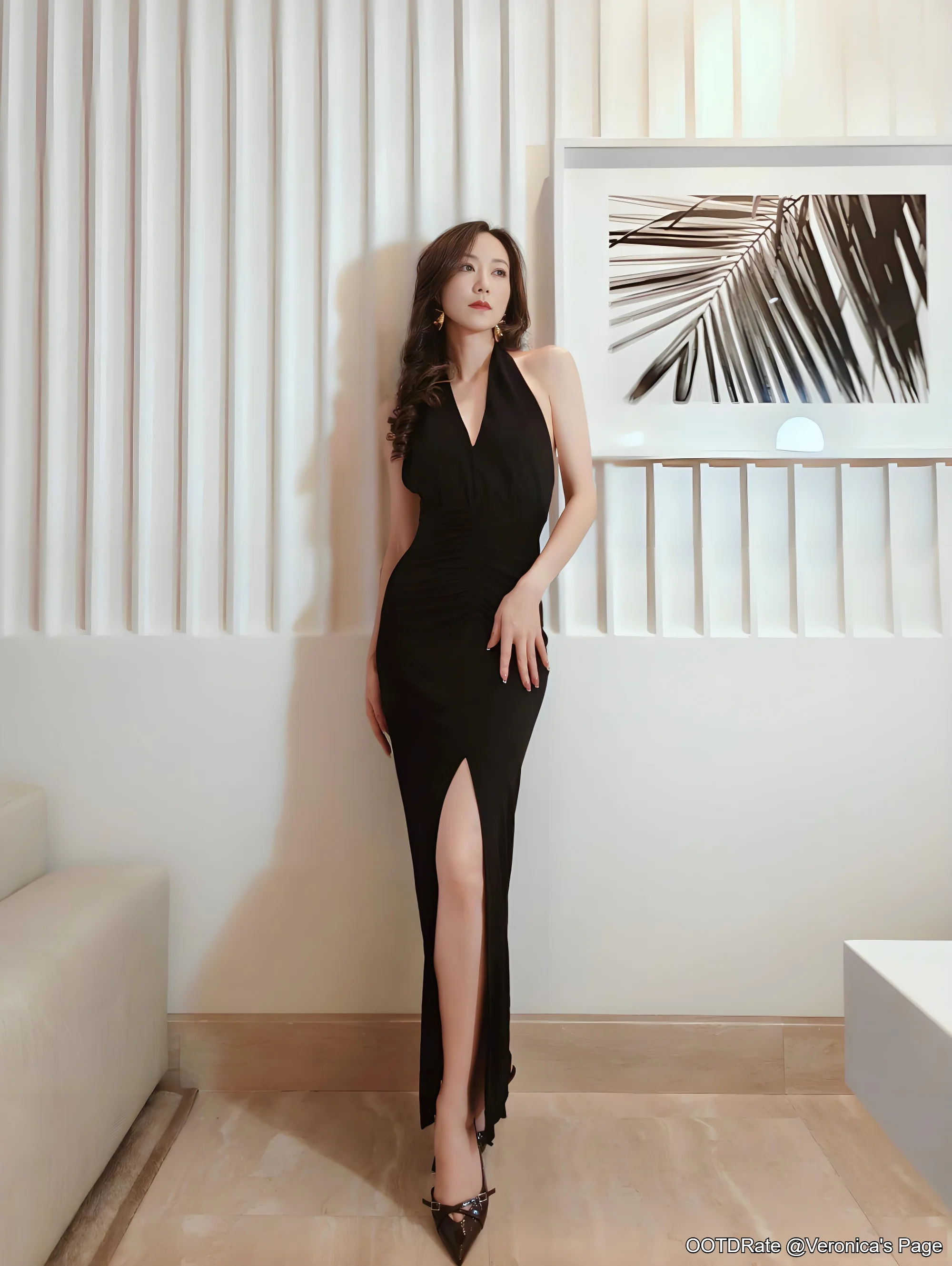 This outfit scores a solid 9.0. The black gown is an epitome of classic elegance, featuring a halter neckline and a daring side slit that adds a touch of sophistication and allure. The dress fits beautifully, enhancing the silhouette in a graceful yet bold manner. The choice of black further underscores its timeless appeal, making it suitable for formal occasions or an evening event.