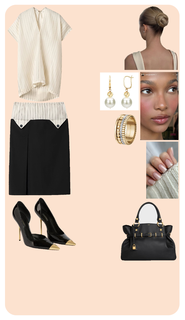 The accessories elevate the outfit significantly. The pearl drop earrings introduce a classic, timeless touch, while the gold ring with subtle embellishments complements the overall luxurious feel. The black handbag with gold accents fits well within the ensemble, offering both functionality and a dash of understated opulence.