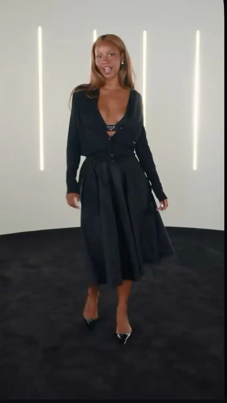The outfit is a chic ensemble composed of a deep V-neck cardigan paired with a mid-length skirt, all in classic black. This monochrome look carries a sophisticated simplicity that exudes elegance. The deep neckline of the cardigan adds a bold, fashion-forward element, while the cinched waist of the skirt creates a flattering silhouette. The choice of black pumps further complements the ensemble, providing a touch of formal polish.