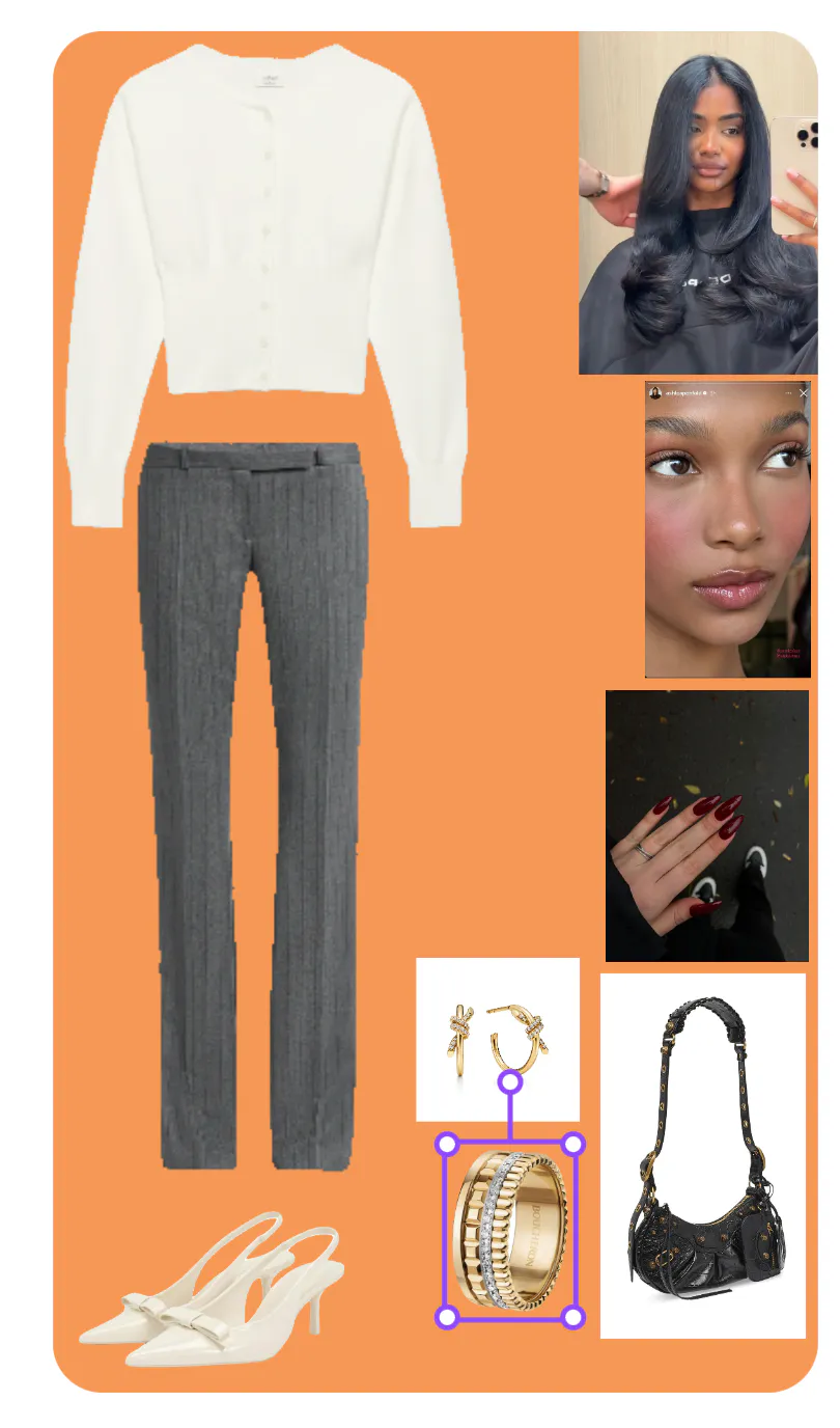 The accessories elevate the outfit further. The white slingback heels add a chic and feminine touch, while the black handbag provides a rich contrast in texture and color. The choice of gold jewelry, including hoop earrings and a statement ring, introduces a subtle yet impactful shine that complements the neutral tones beautifully.