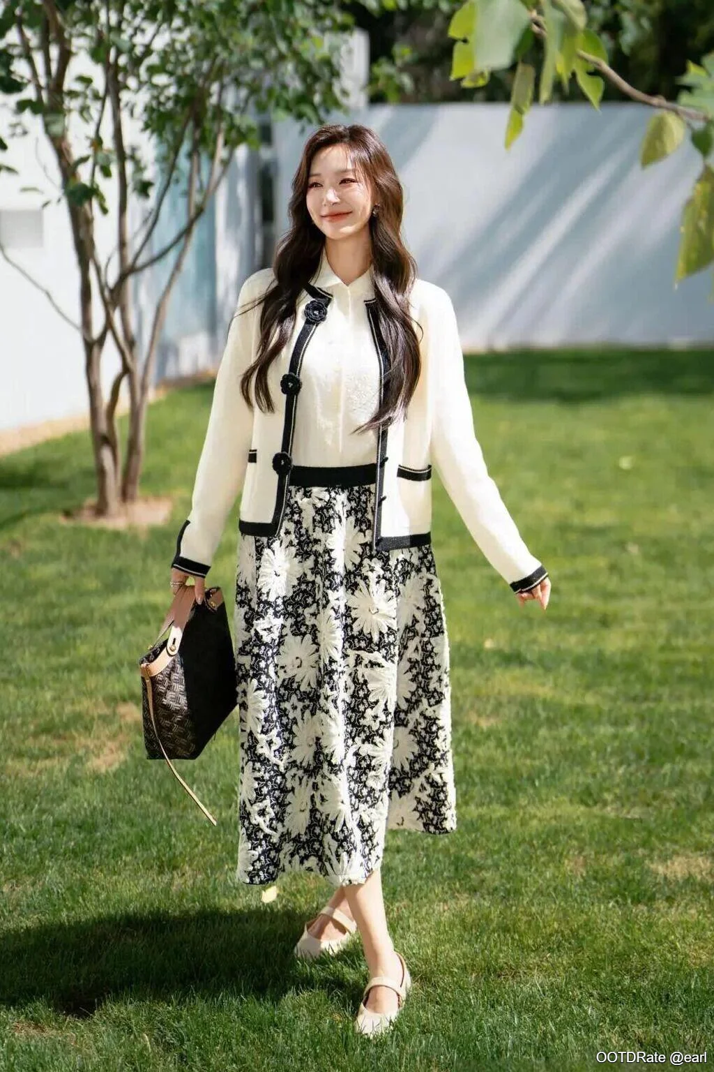 This outfit scores a 9.0 for its elegant and sophisticated aesthetic. The ensemble is anchored by a cream and black color palette that offers timeless appeal and versatility. The cream cardigan with black trim is a classic piece, adding a polished touch to the overall look. Its tailored fit enhances the silhouette, providing a structured yet comfortable feel.
