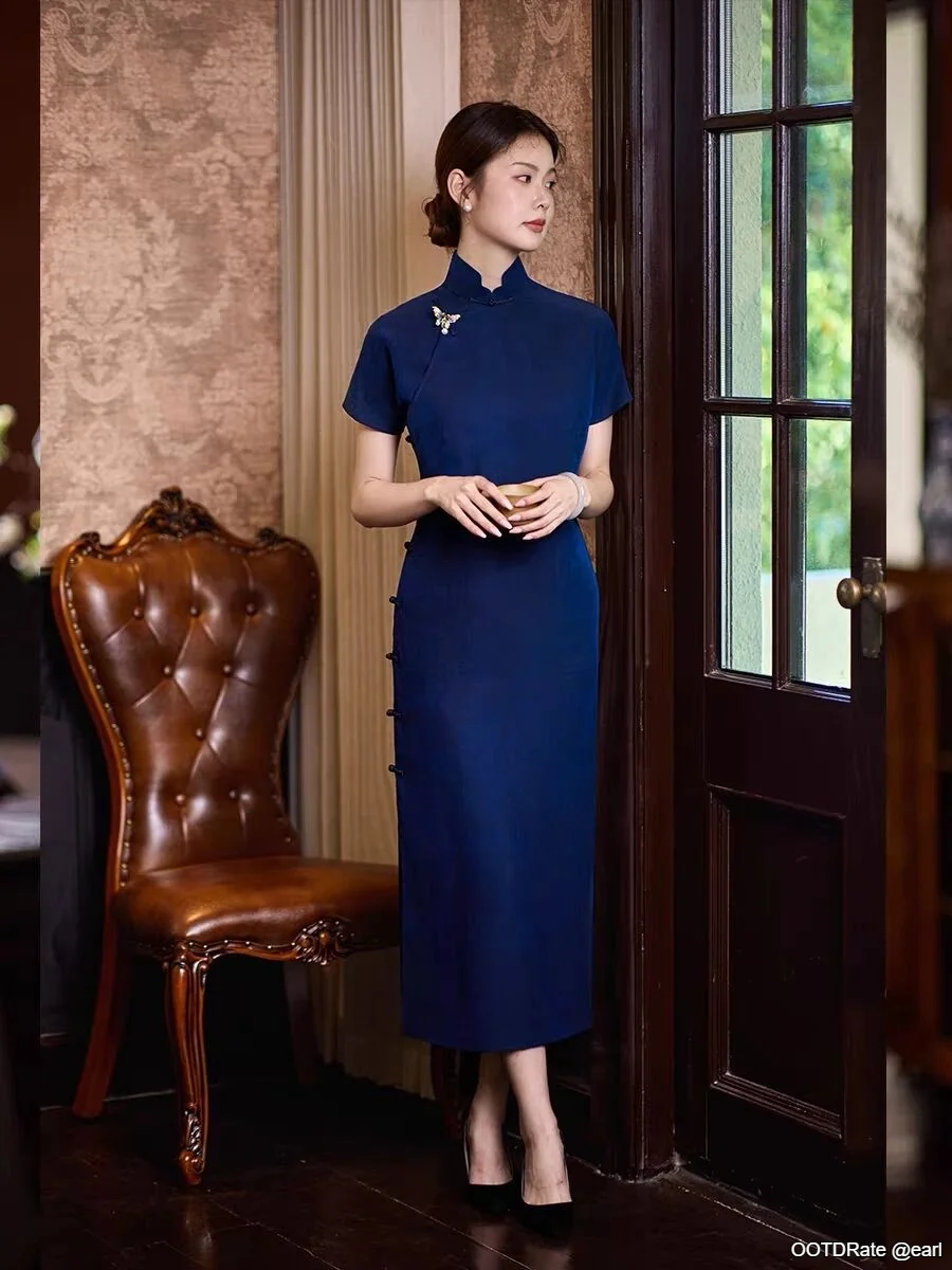 This outfit exudes elegance and sophistication, capturing a timeless and classic look that is truly impressive. The dress is a beautiful deep blue, which adds a sense of depth and richness to the overall ensemble. The high collar and cap sleeves provide a modest yet graceful silhouette that is both regal and refined. The straight cut of the dress, featuring side buttons, enhances the traditional style, offering a perfect balance between vintage and contemporary fashion.