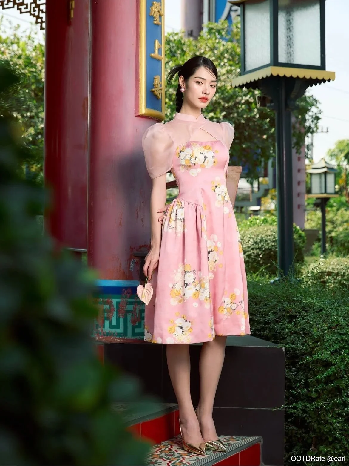 This outfit features a charming pink floral dress with sheer puff sleeves, exuding a romantic and feminine vibe. The floral pattern is delicate and perfectly suited for a spring or summer occasion, adding a touch of freshness to the ensemble. The dress's silhouette, fitted at the waist and flaring into an A-line skirt, is timeless and flattering, enhancing the figure elegantly.