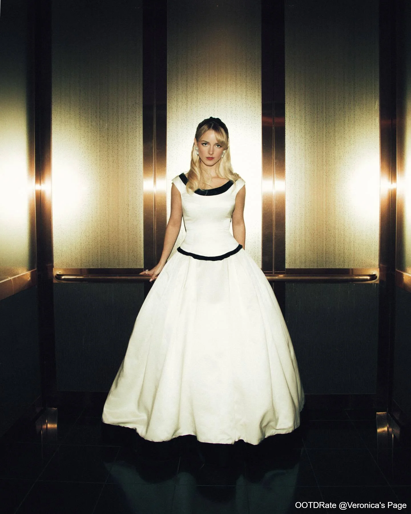This elegant ensemble scores an impressive 9.0. The standout feature is the classic black-and-white color scheme, which always exudes timeless sophistication. The full skirt adds volume and drama, while the fitted bodice emphasizes a refined silhouette. The contrasting black accents, especially around the neckline and waist, provide a striking focal point that enhances the overall elegance of the gown.