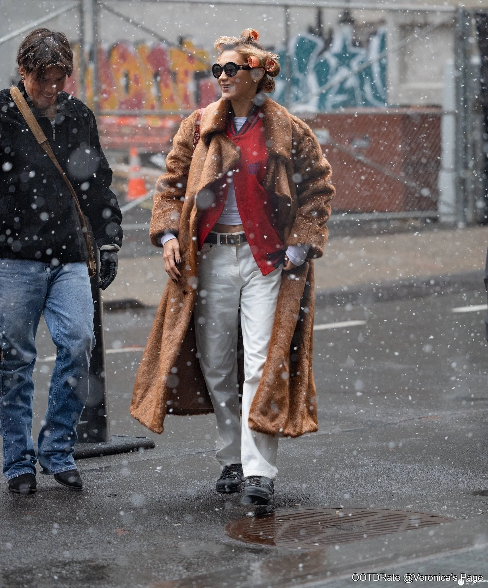 Bella Hadid's New York Street Style: Faux Fur Coat with Red and White Accents
