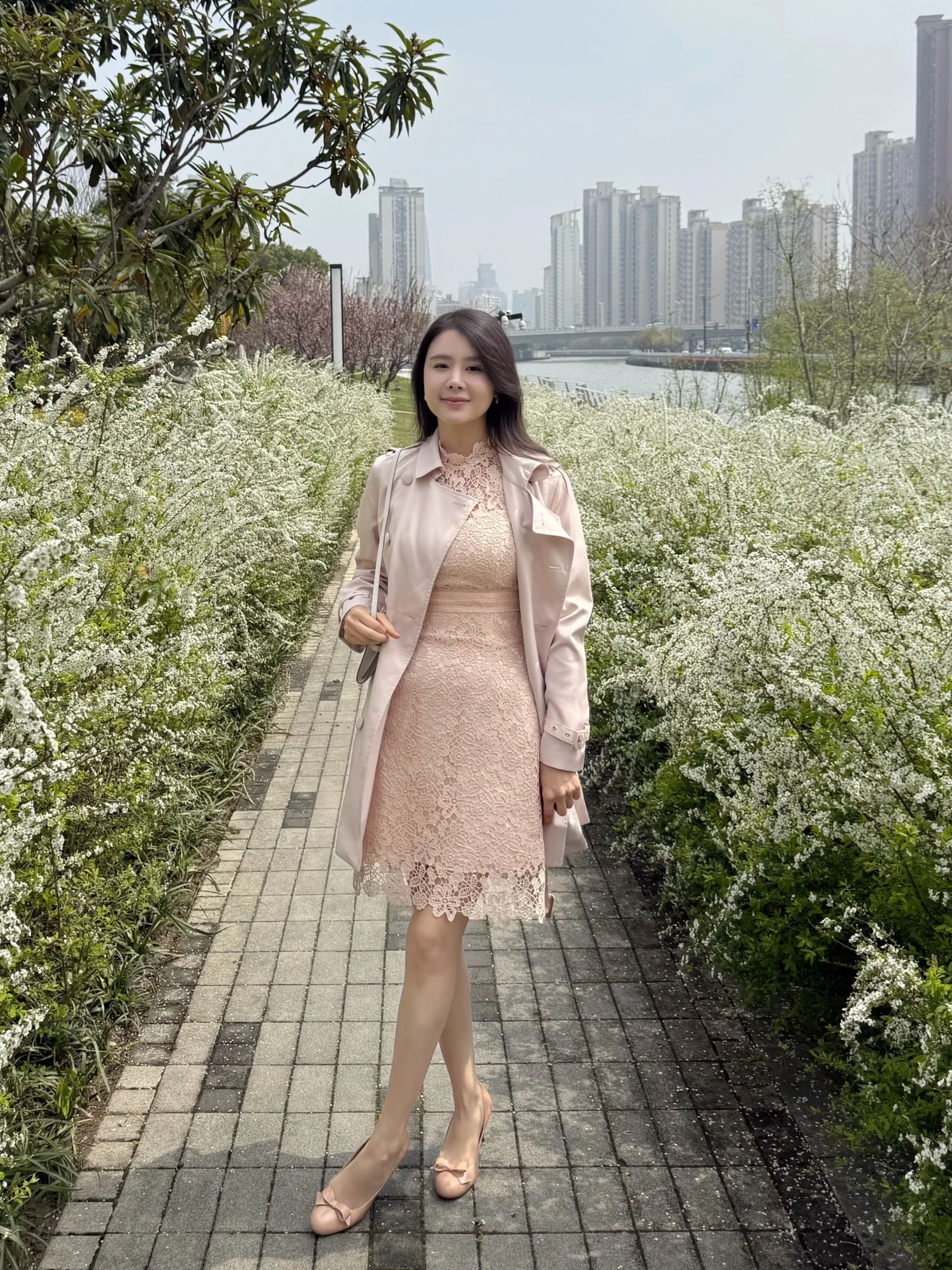 Elegant Blush Lace Dress with Light Pink Trench Coat for a Sophisticated Look