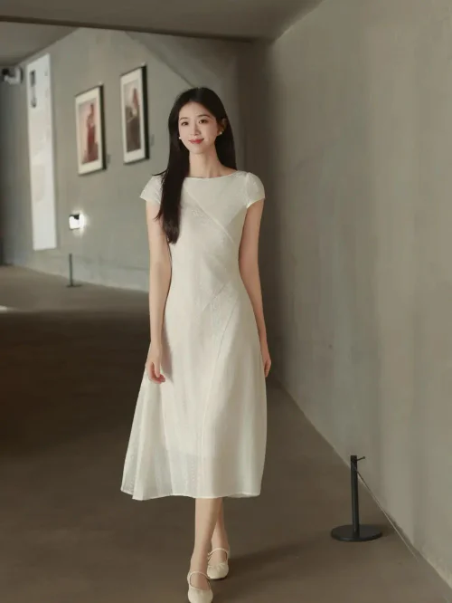 The minimalist design is enhanced by subtle textural details, providing visual interest without overpowering the dress's simplicity. The cap sleeves contribute to the overall delicate appearance, keeping the style understated and chic. The choice of a neutral, monochromatic palette furthers the elegant feel, while the length of the dress offers a conservative yet stylish option.