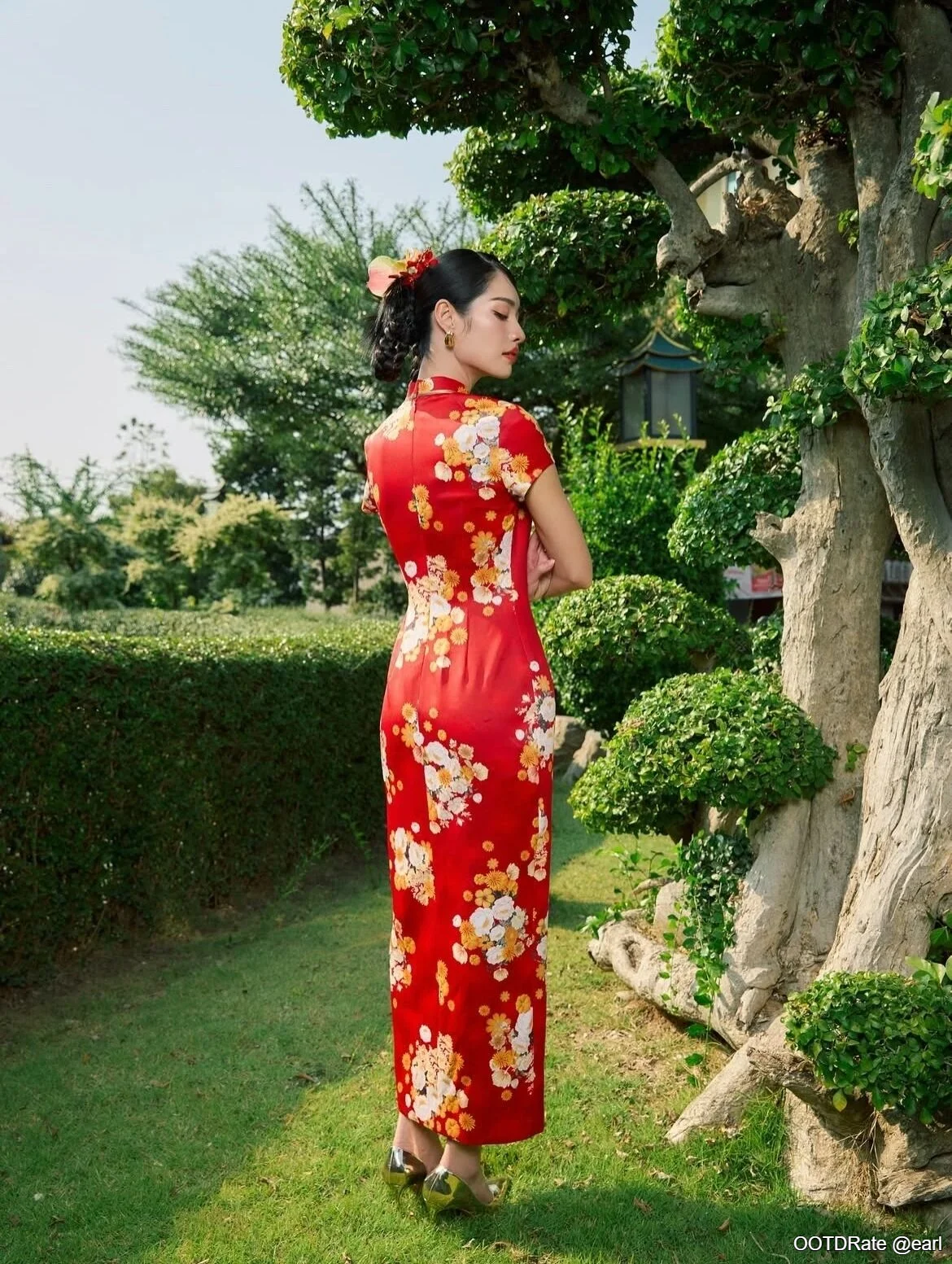 This outfit is a stunning example of traditional elegance combined with modern sophistication. The red qipao dress is the highlight, featuring intricate floral patterns that add an artistic and culturally rich touch. The color red not only signifies luck and prosperity in Chinese culture but also complements the lush greenery in the background, making the entire ensemble pop beautifully.