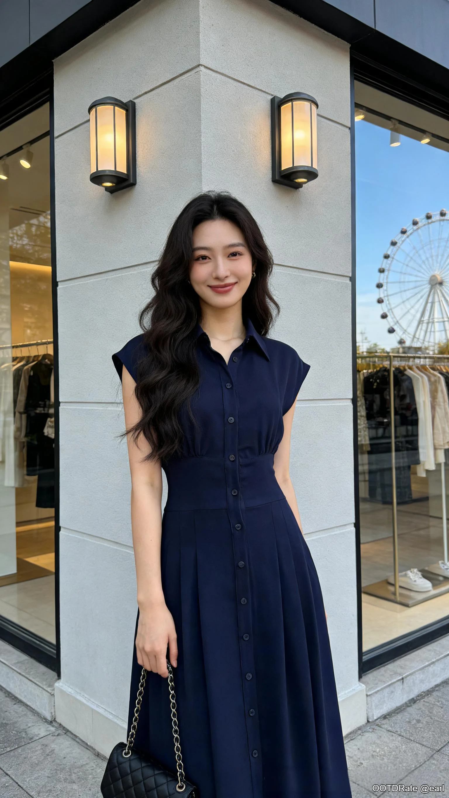 Elegant Navy Blue Shirt Dress with Quilted Black Bag for a Sophisticated Look