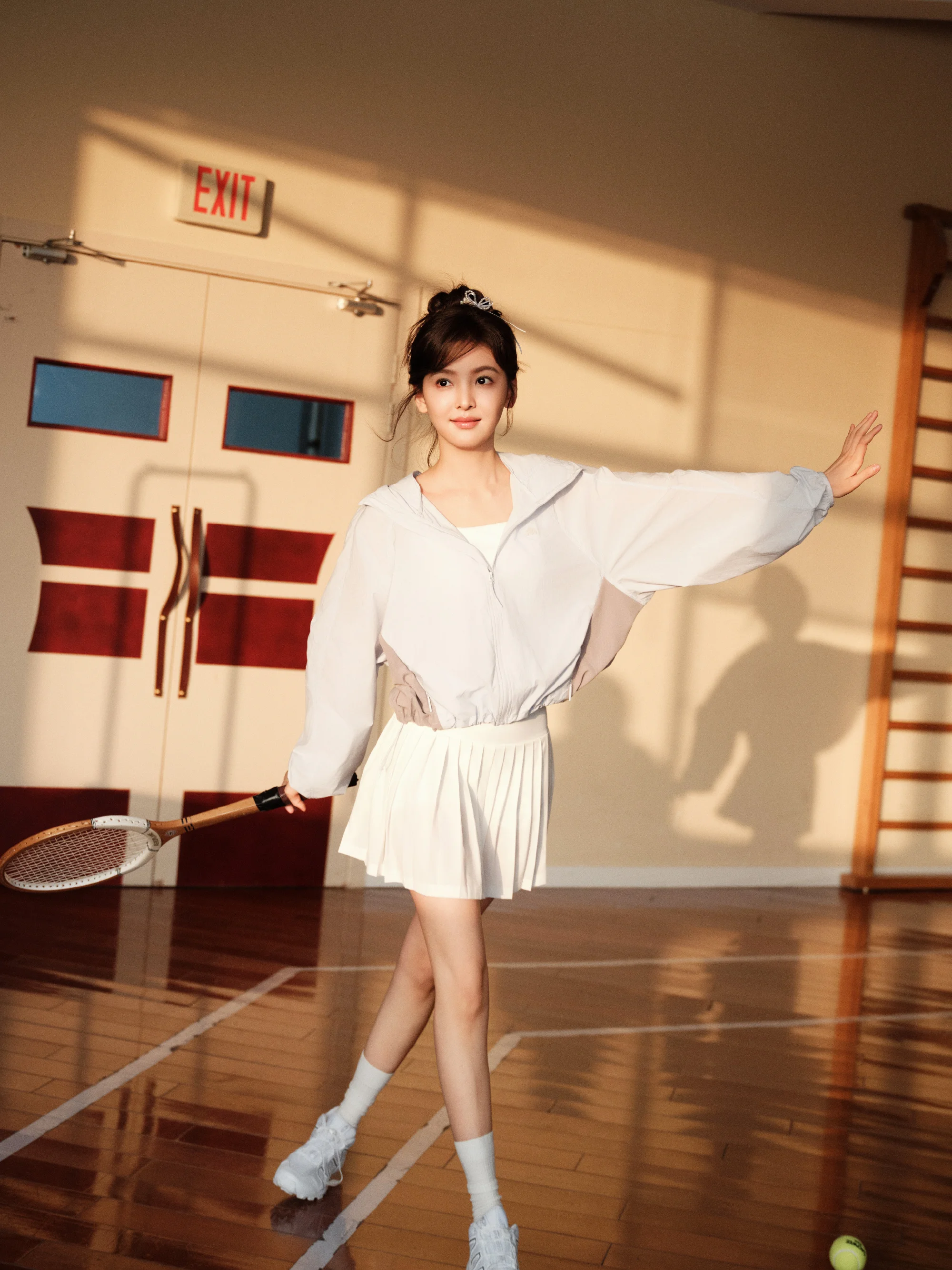 This outfit is a beautiful blend of sporty and stylish elements, perfectly suited for a casual tennis game or sporty day out. The light, airy fabric of the zip-up jacket combined with its oversized fit adds a trendy and relaxed vibe to the look. The choice of a white color palette enhances the fresh and youthful appearance, providing a clean canvas that reflects light beautifully.