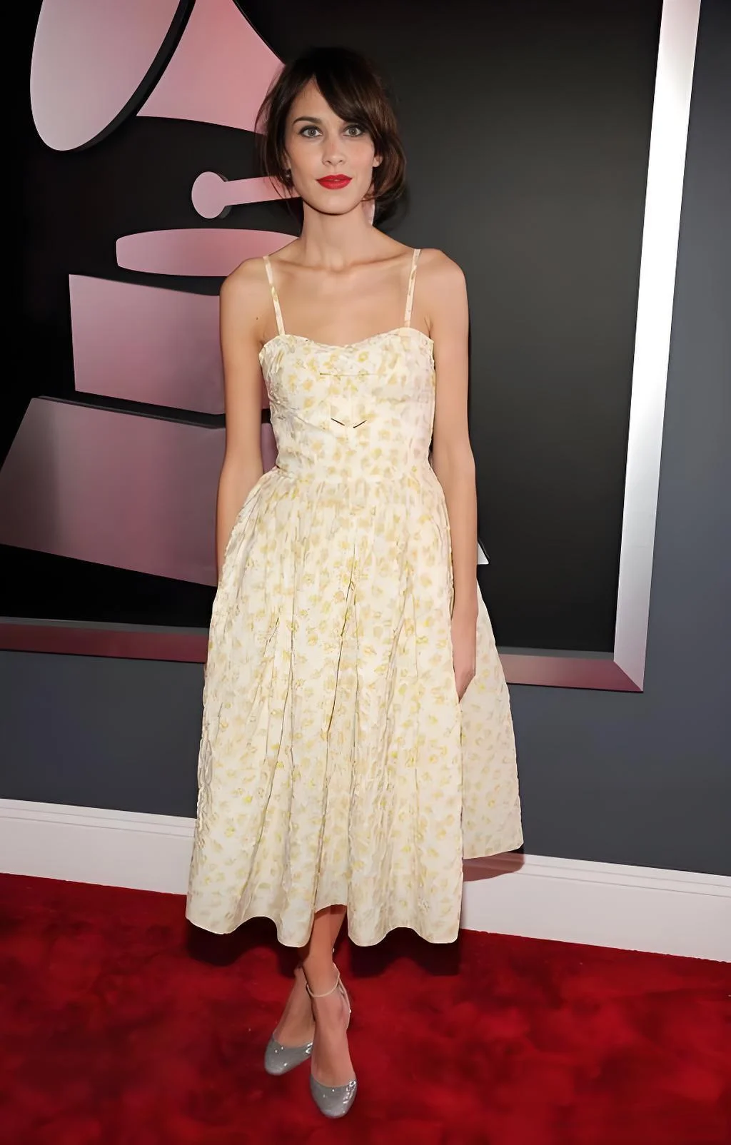 The choice of footwear—a pair of subtle, shimmery flats—complements the dress well, adding just a hint of sparkle without overwhelming the look. The flats maintain the vintage feel of the outfit and keep the overall style cohesive and grounded.