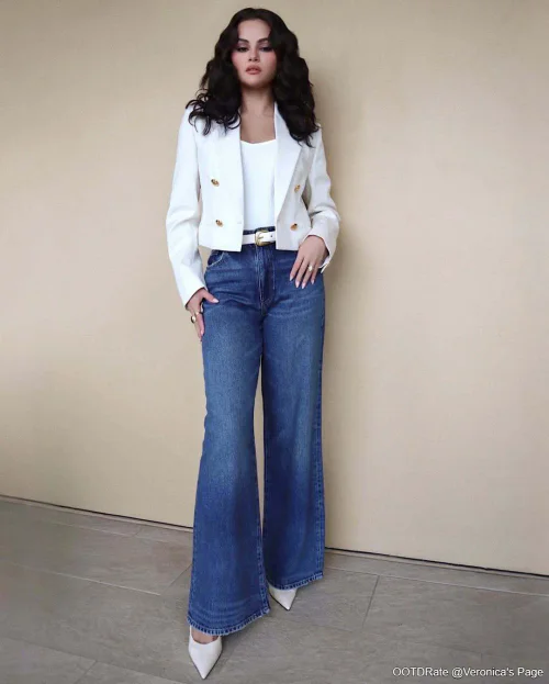 This outfit receives a rating of 9.0. The combination of a crisp white blazer and tank top with high-waisted wide-leg jeans creates a modern and chic aesthetic. The blazer fits well, offering a structured look that contrasts nicely with the relaxed silhouette of the jeans. The gold buttons add a touch of sophistication and subtly complement the belt detail. These elements together enhance the outfit's visual interest without overpowering it.