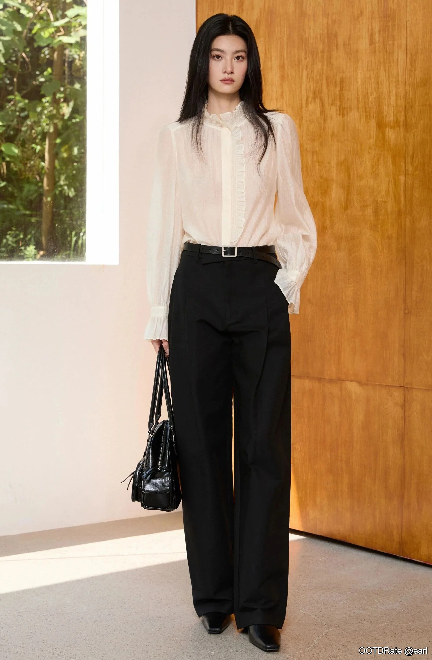 This outfit is a refined example of minimalist elegance, featuring a classic white blouse paired with black high-waisted trousers. The blouse, with its delicate ruffle detailing and voluminous sleeves, adds a touch of femininity and sophistication. The tucked-in design ensures a polished silhouette, ideal for professional or formal settings. The understated black belt is a practical accessory that subtly defines the waist and brings cohesion to the ensemble.