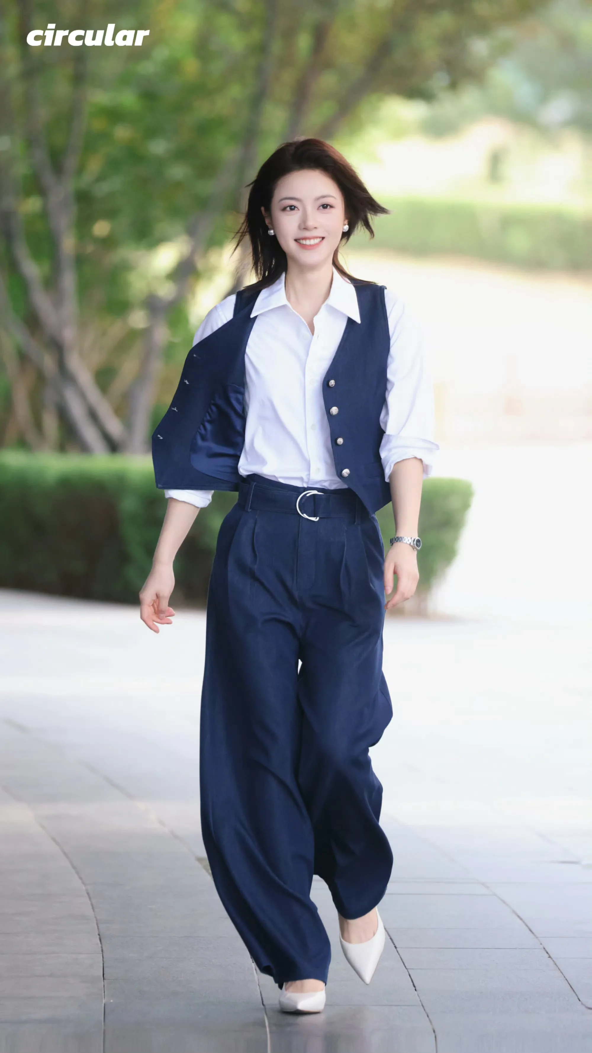 This outfit rates a solid 9.0. The coordination between the navy vest and wide-leg trousers creates a harmonious and elegant look, perfect for both professional settings and more casual outings. The deep navy blue contrasts beautifully with the crisp white shirt, adding a classic and timeless appeal. The tailored fit of the vest complements the relaxed cut of the trousers, providing a balanced silhouette that enhances movement while maintaining sophistication.