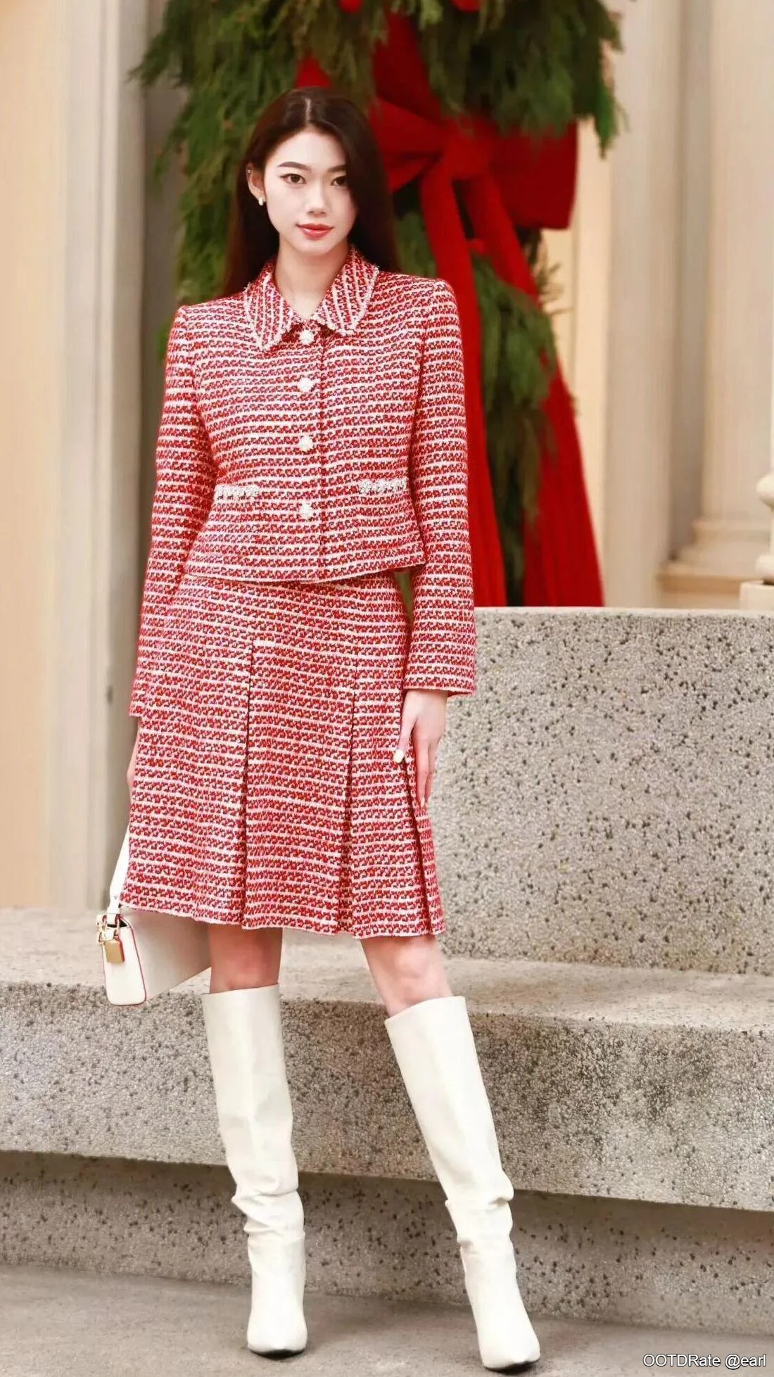 Elegant Red Tweed Skirt Suit with Knee-High White Boots - Classic Meets Modern