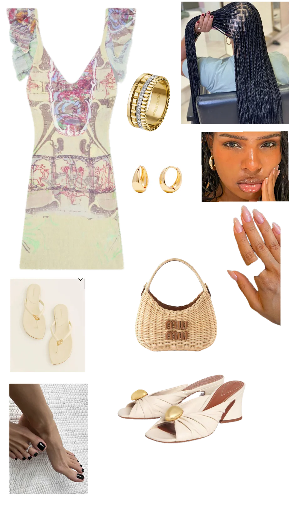 The sandals, with their simple yet chic design, contribute to a relaxed, summery vibe. Their neutral color aligns seamlessly with the rest of the ensemble, creating a harmonious look. The inclusion of a woven basket bag introduces a playful, rustic element, perfect for achieving a breezy and casual style.