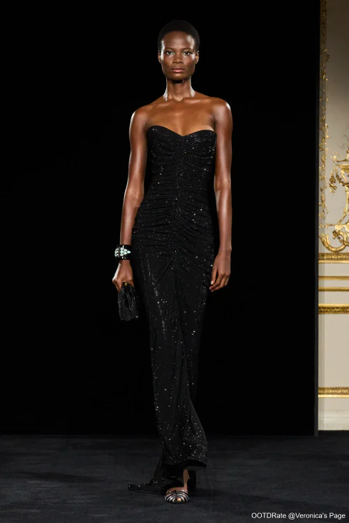 This outfit scores a 9.5 out of 10. The elegance of this black strapless evening gown is undeniable, with its structured silhouette that beautifully highlights the wearer's figure. The dress features a subtle sheen, attributed to the delicate sparkle embedded within the fabric, which adds an element of glamour without overwhelming the simplicity of the design. The ruching is expertly done, complementing the body's curves and providing texture to the otherwise sleek silhouette.
