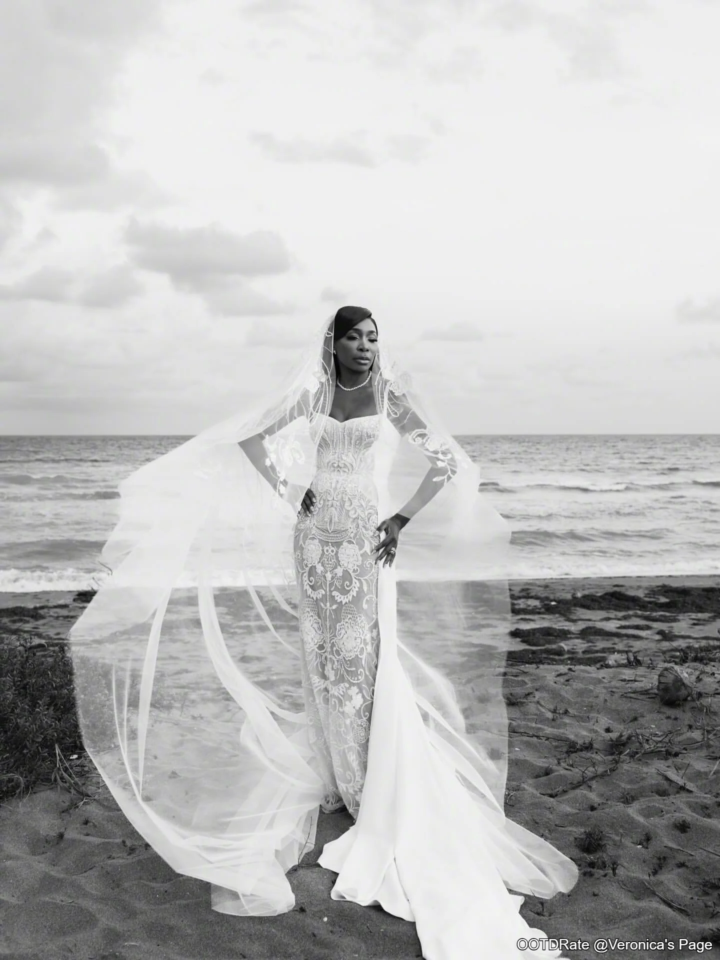 Venus Williams poses for photos on the beach in a pure white wedding dress.